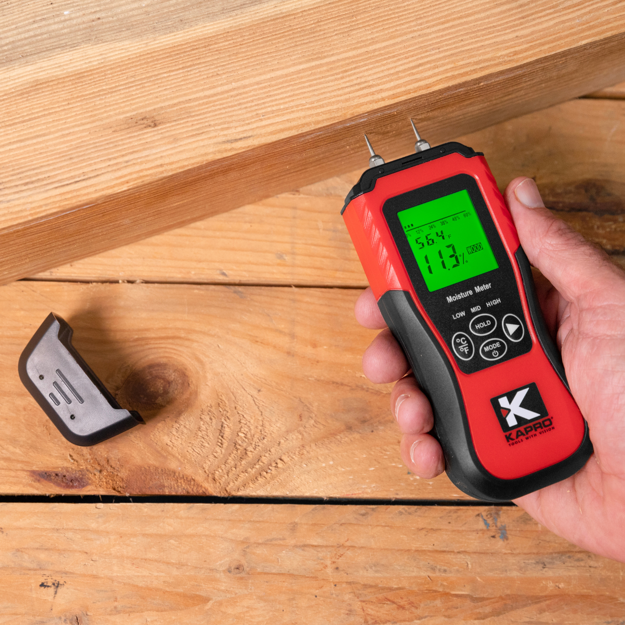 Detect early signs of mold and rot by measuring moisture level and temperature of various wood materials with Kapro's 379 Moisture Meter. Works on wood, floors, ceilings, etc.
