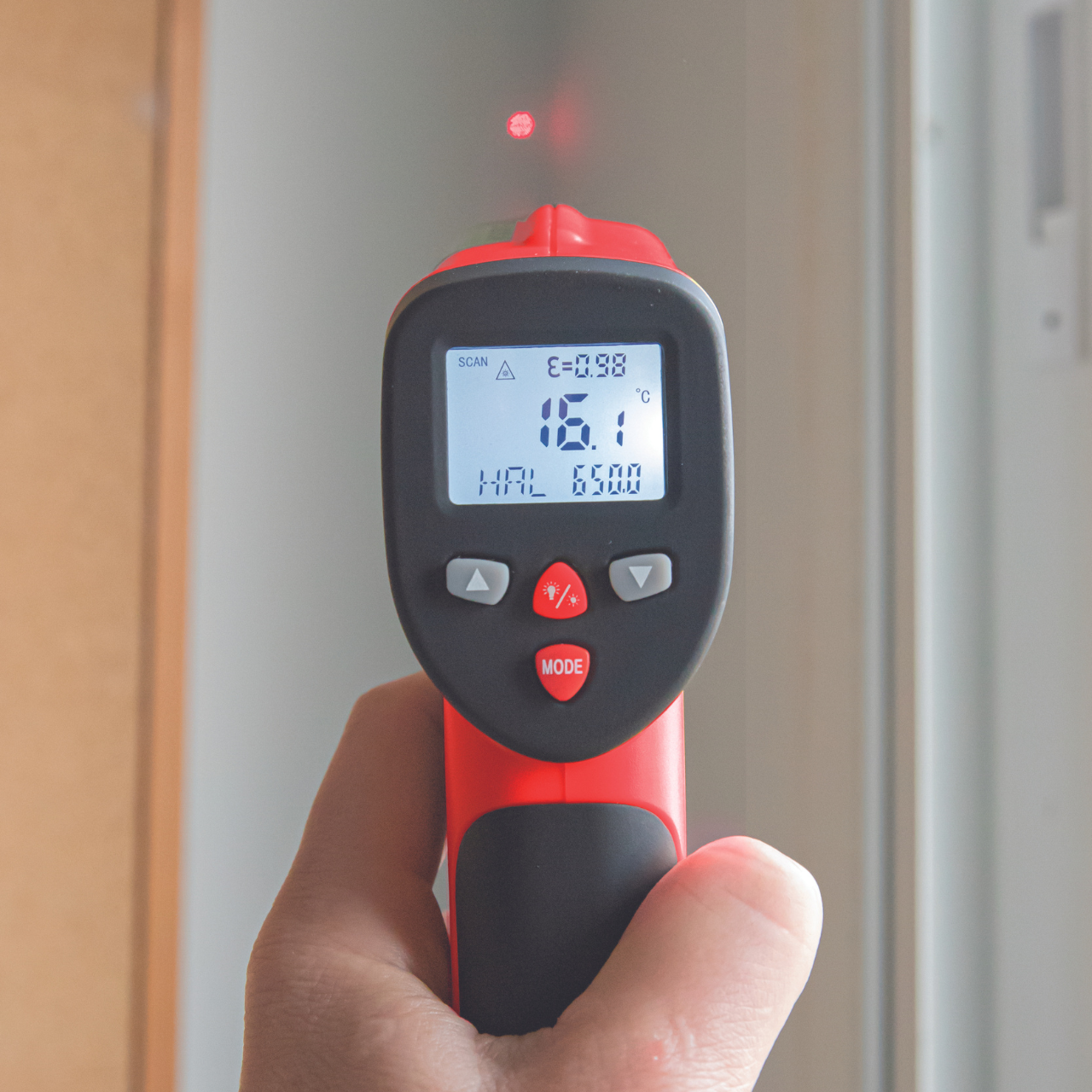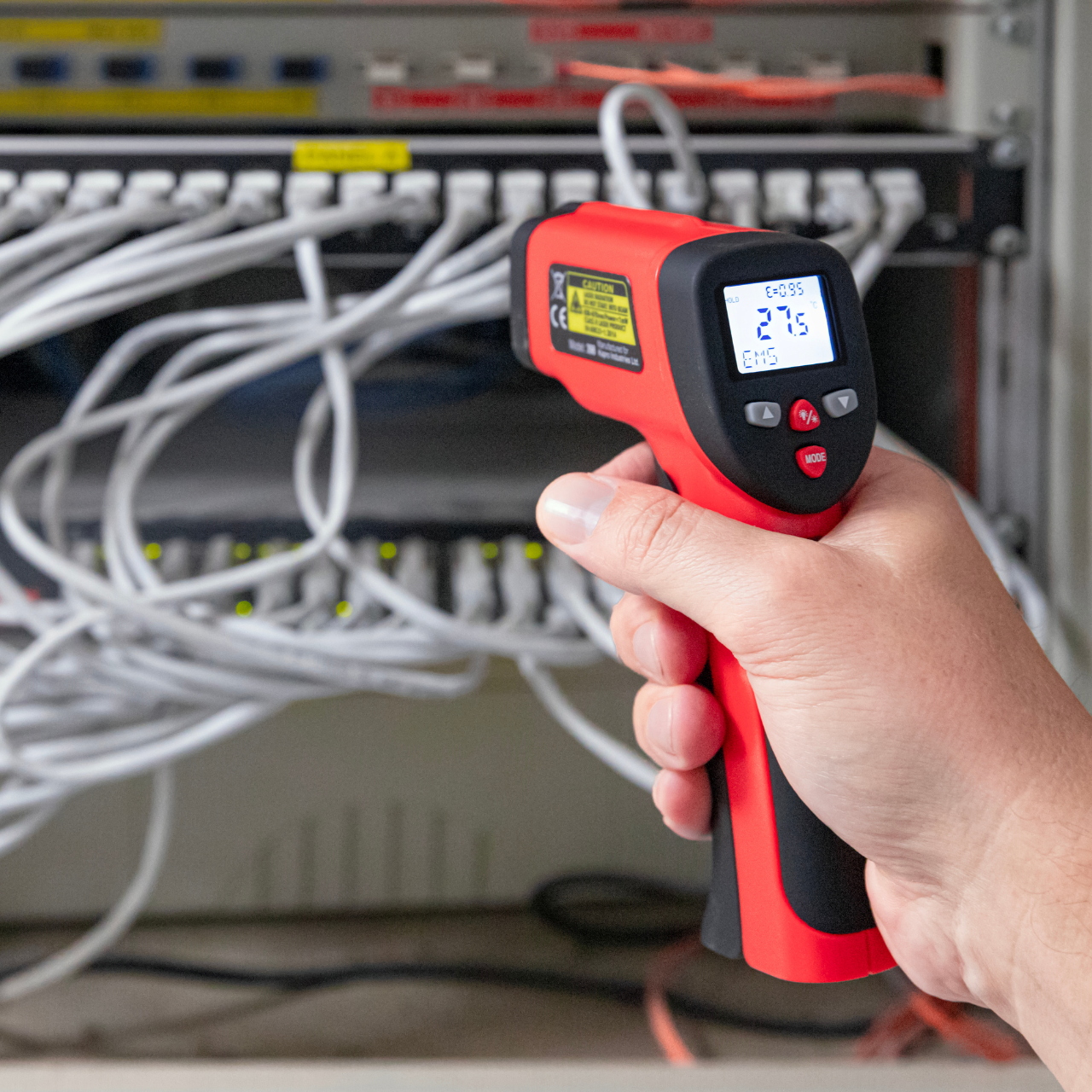 The 398 measures temperature between -58°F to 1,202°F / -50°C to 650°C with a 12:1 distance to spot size ratio. Emissivity is adjustable from 0.01 ~ 1.0.